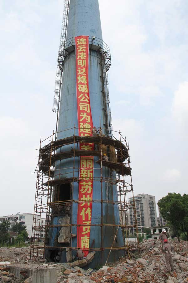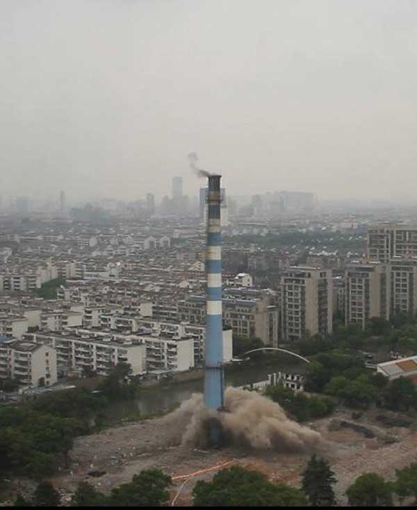 蘇州市地標建筑之一,矗立在蘇州城南的蘇州熱電廠大煙囪,該煙囪高80m,周圍有小區(qū)、學(xué)校、高架橋、小商品市場,爆破環(huán)境復(fù)雜。我公司技術(shù)人員仔細勘察現(xiàn)場后,編制詳細的爆破方案。最終于2016年8月26日下午3點整實施爆破拆除,伴隨蘇州人33年的電熱廠大煙囪從此成為歷史。